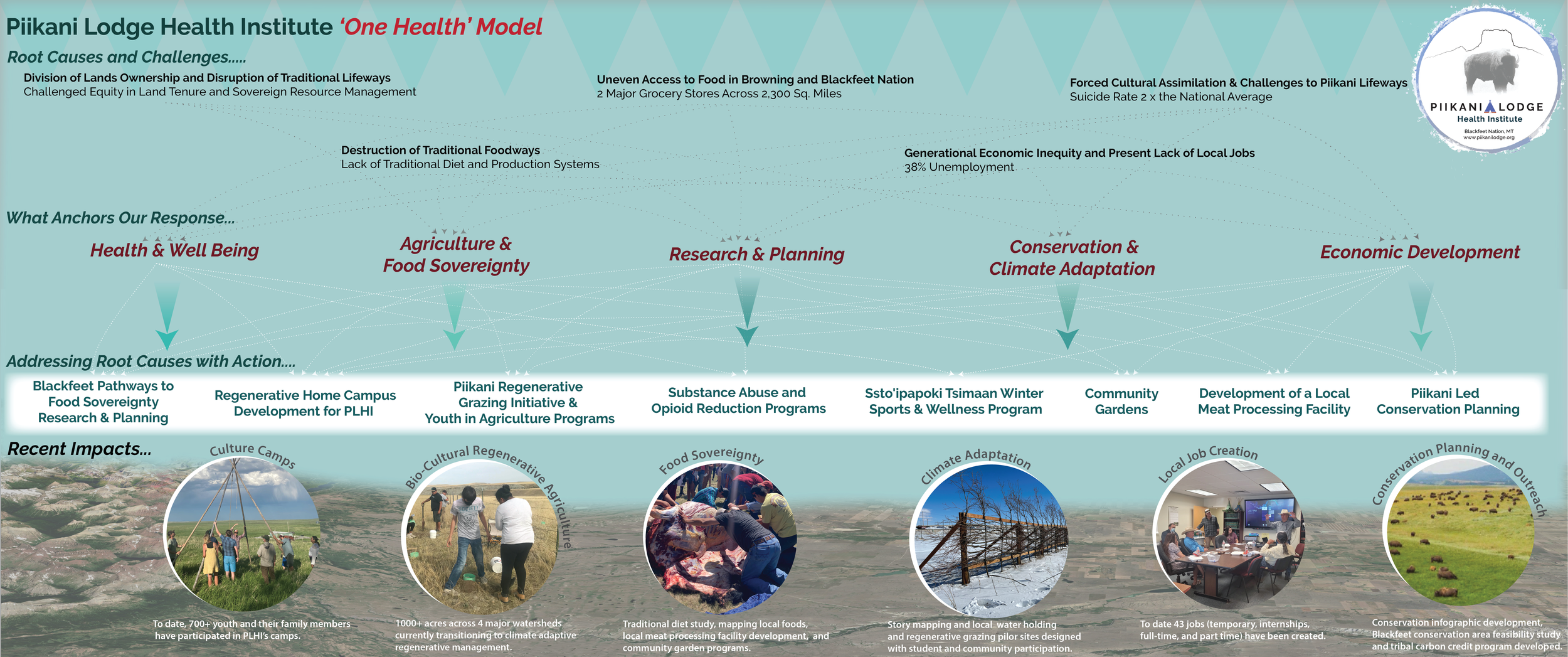 Piikani Lodge Health Institute (PLHI) is an Indigenous-founded and led nonprofit organization focused on promoting the health and well-being of Blackfeet (properly known as ‘Amskapi Piikani’) people and lands. PLHI works across both human and ecological domains to promote Indigenous health and well-being.